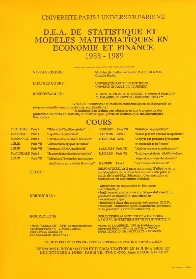 Le M2MO, plus formellement Master 2ème année Mathématiques et Applications – Modélisation aléatoire, est le fruit d'une longue histoire qui commence dans la deuxième partie des années 1980 sous l'impulsion de Laure Elie avec la création d'un DEA commun aux universités Paris I et Paris VII : "Statistiques et Modèles Mathématiques en Economie et Finance" (voir l'une des premières affiches).